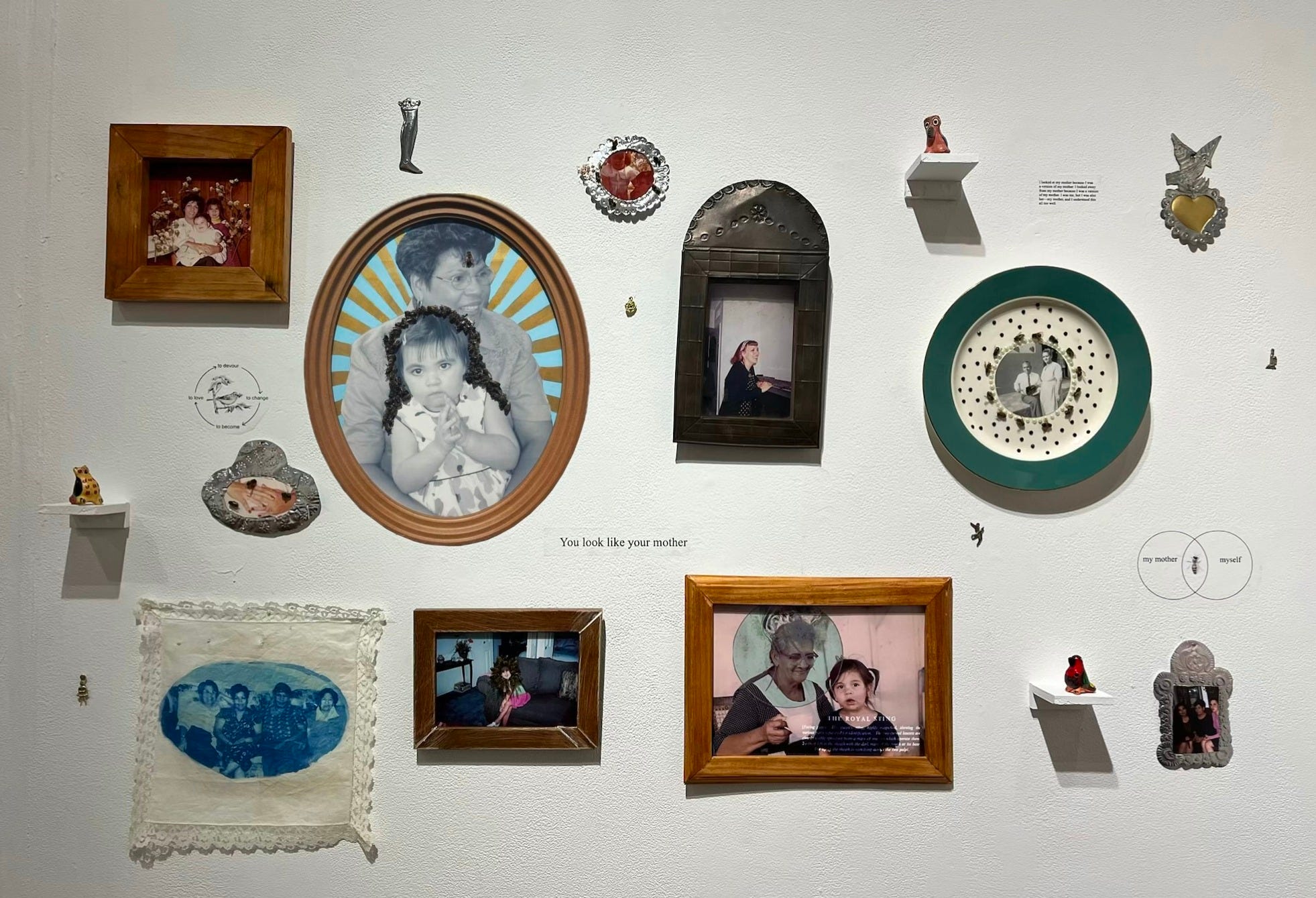 Aolani Tagle’s The Master Archives of Turning Into a Bee for the University of Texas San Antonio Fall 2025 BFA Exhibition was a magnificent arrangement of family pictures, ceramics, aluminum, wood, and dead bees. Tagle incorporated bees throughout the piece, on images of herself, around her great-grandfather, and used a queen bee on her grandmother’s forehead. Her use of bees not only honors her great-grandfather’s line of work as a beekeeper, but also matriarchal societies. Bee colonies are matriarchal; the queen and worker bees in a hive are female. Placing a queen bee on her grandmother’s forehead can be seen as reinforcing this strong female figure in Tagle’s life, as the queen bee is in a hive.