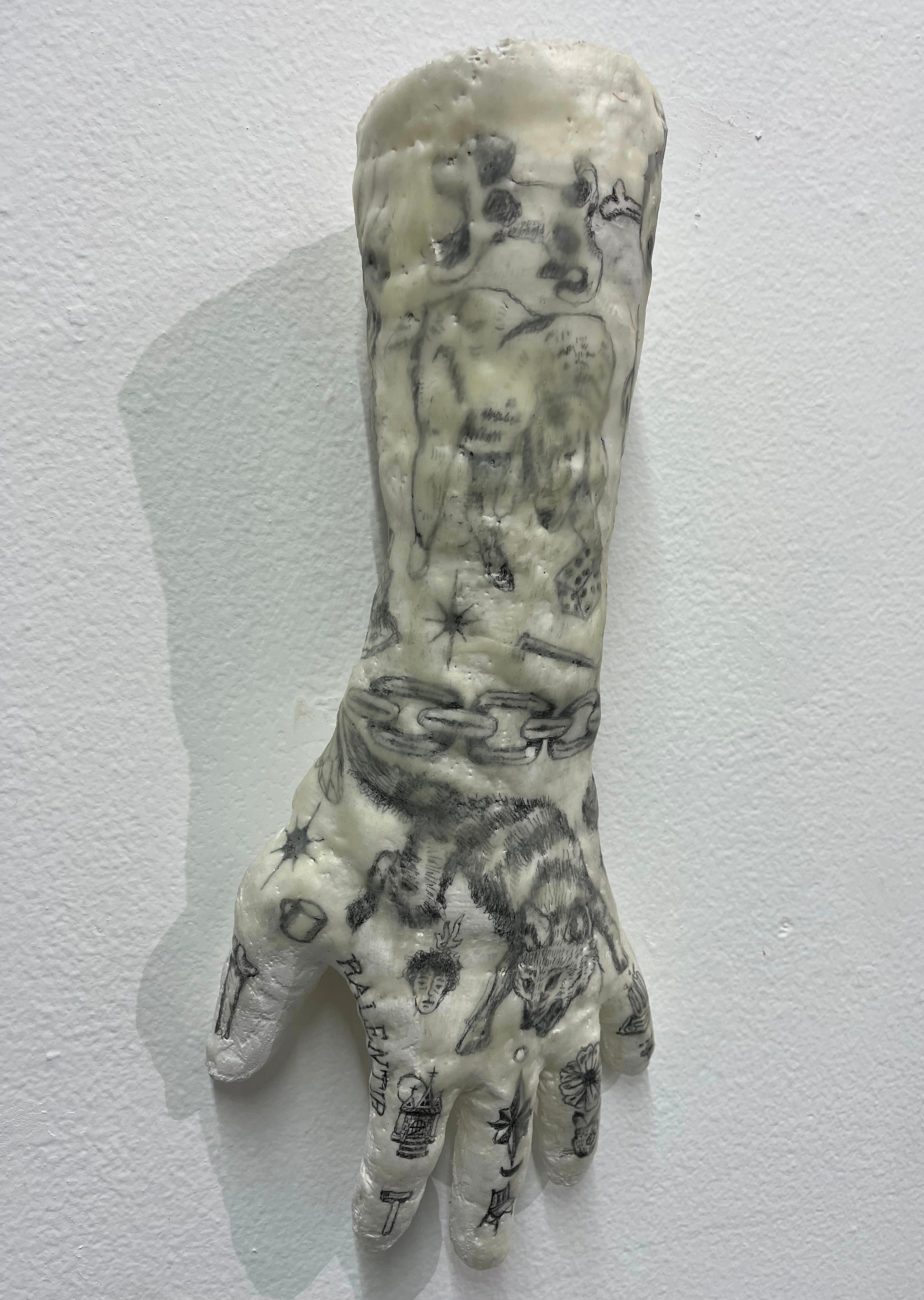 Brenden Cicoria’s splendid ralentir was featured in the We’re in the Industry exhibition at Interloper Gallery. A hallow sculpture made of plaster, wax, and graphite, visually the piece looks like a cast or glove, but there is a sense of spiritual presence in ralentir. A variety of drawings are drawn directly onto the piece, with the French word ralentir encompassing the space between the thumb and index finger. Ralentir means “to slow down”; perhaps a reminder to remember to take time to slow down our busy lives.